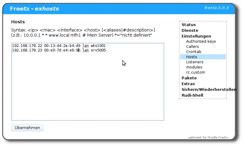Die unter "DHCP-Server" angesprochene feste Zuordnung von IP-zu-Mac lässt sich hinter diesem Link einstellen. Man kann es auch unter Einstellungen - Hosts erreichen. Die Zuordnung ist trivial. Man muss lediglich drei, aber besser vier Einträge vorgeben. Ein Kommentar ist optional auch möglich. Eine Beispielkonfiguration ist auf folgendem Bild zu erkennen.