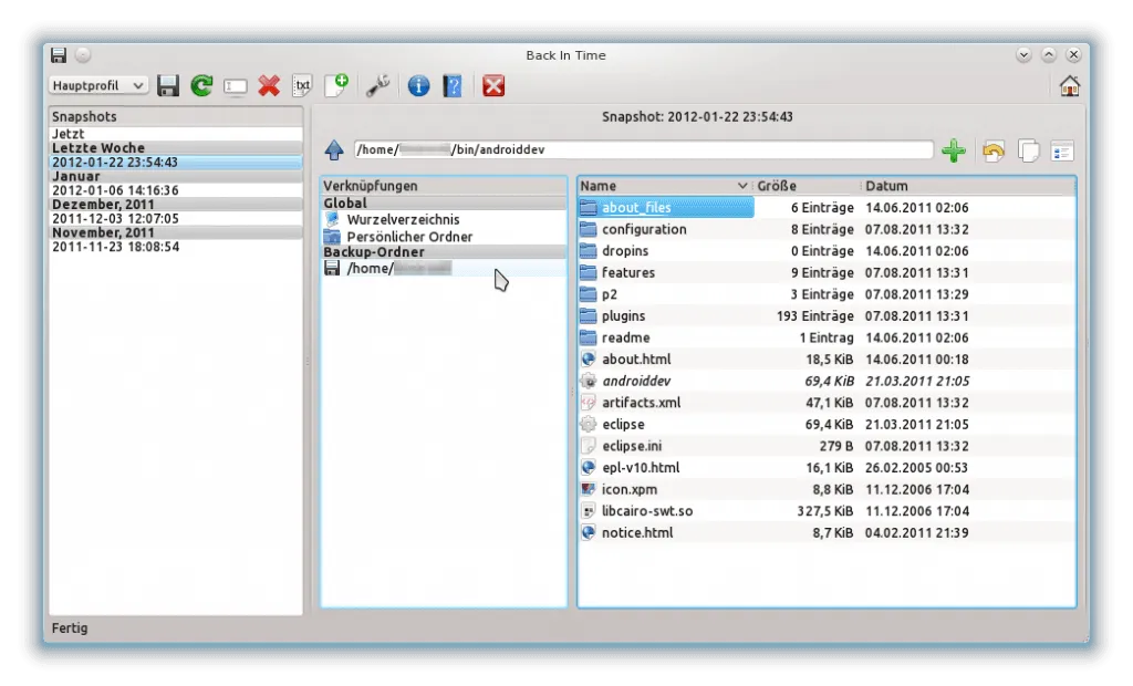 Das schöne an Back in Time ist, dass es auf bekannte und sehr ausgereifte Tools setzt. Es ist gewissermaßen »nur« eine GUI für rsync, diff und cp. »Nur« trifft es aber nicht ganz, weil diese sehr durchdacht wirkt. Optionen sind logisch gruppiert und ebenso gut erklärt. Die Navigation folgt dem Schema »von links nach rechts«: Das Datum steht links, in der mittleren Spalte befindet sich der »Hauptordner« und rechts die jeweils gewählten Unterordner.