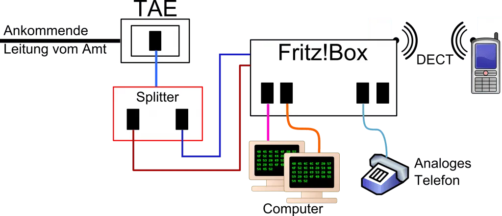 Dieser Anschlusstyp ist heute aber veraltet. Da keine analogen Telefone mehr genutzt werden, kann die volle Frequenzbandbreite in das DSL-Modem geleitet werden. Die unteren Bereiche werden einfach nicht genutzt. Außerdem fällt ein Bauteil weg, was ggf. das Signal nur unnötig dämpft. Von der TAE (der Telekommunikations-Anschluss-Einheit, umgangssprachlich Telefondose) führt das Kabel also nun direkt in das DSL-Modem, meistens in Verbindung mit einem Router (etwa eine Fritz!Box).