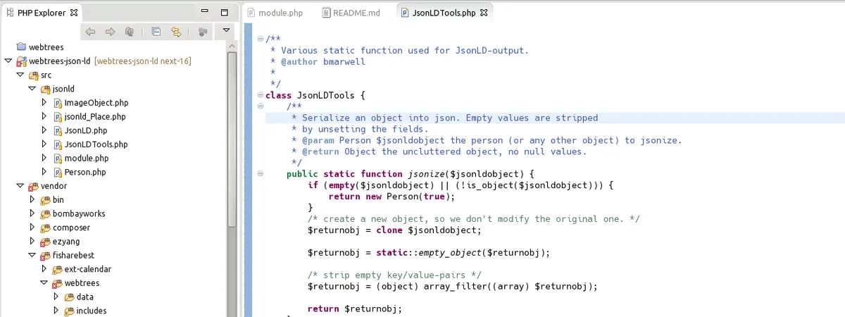 Hier zu sehen ist mein Webtrees-Plugin »json-ld«, welches ich bereits vorgestellt hatte. Man sieht deutlich, dass besonders die leeren Zeilen eine Ruhe in den Quellcode bringen, ohne Platz zu verschwenden. Die Fettschreibung der reservierten Wörter ist kräftig, aber noch dezent. Es ergibt sich ein tolles Gesamtbild. Unter Windows war mein Eindruck allerdings weniger gut - dort schien die Schriftart in Eclipse eher dünn und unscharf zu wirken.