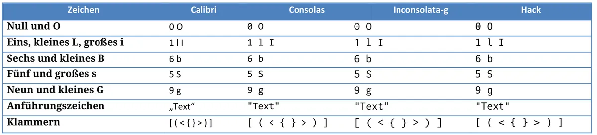 Der Vergleich zeigt: Während eine Standard-Schriftart (hier: Calibri) die Unterscheidung zumindest nicht besonders vereinfacht, ist die Unterscheidung bei allen Programmiersprachen recht einfach. Hack hat allerdings ein gerades g, welches etwas schwerer von der Neun zu unterscheiden ist, als bei Consolas oder Inconsolata-g. Auch die Null sticht durch den senkrechten statt schrägen Strich bzw. Punkt fast schon unangenehm heraus - das ist aber gerade so gewollt. Besonders gut gefällt, dass bei Consolas und Hack die spitzen Klammern nicht zu klein sind - diese sind bei Inconsolata-g doch etwas zu sehr nach oben versetzt, was im Quellcode komisch aussieht. Bei Hack laufen sie zudem noch etwas spitzer zu, bei Consolas eher stumpf - was besser gefällt, muss jeder für sich entscheiden.