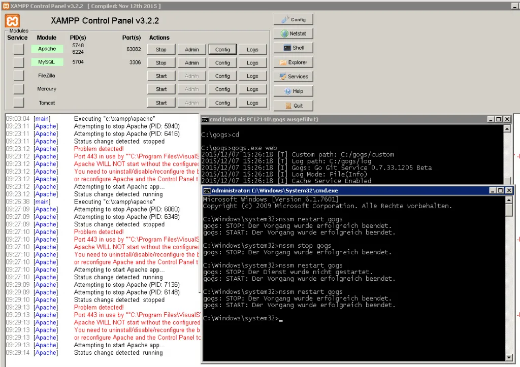 As the gogs install guide for windows explains, you can also make gogs git server a windows service. You can use nssm (non-sucking service manager) for this task. As your cansee from the (german) screenshot above, the service was started and restarted using nssm. I also used XAMPP to provide a MySQL database and an apache httpd as proxy using the config from above.