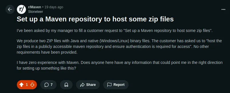 The user wanted to set up a Maven repository to host some zip files. I thought this was a good idea, but I also thought that the user might not need to set up a Maven repository at all. In this article, I will guide you through some software repositories available and which you might already use.